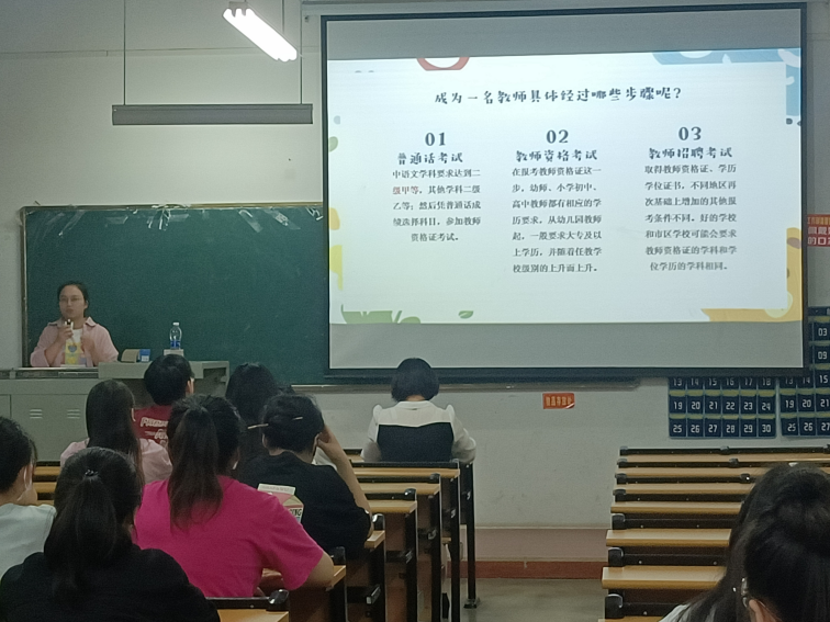 首先,孙文静老师指出,成为一名教师的具体步骤就是要依次通过普通话考试、教师资格考试,教师招聘考试,同时,她根据个人实例,讲述她在面试时的情况和过程,使在座的实习生对其有了更加深刻的认识和了解。