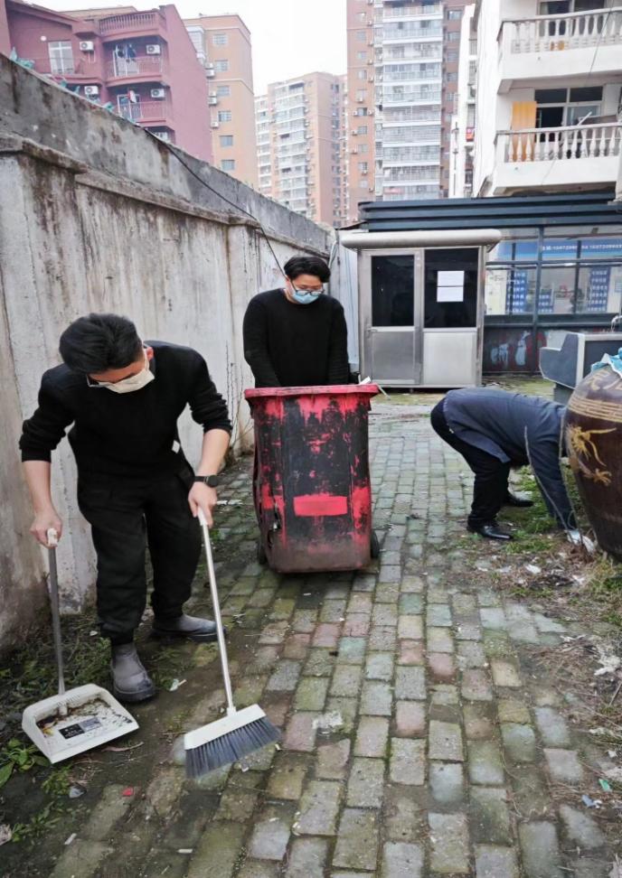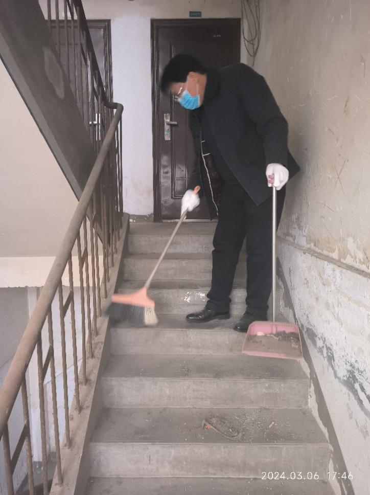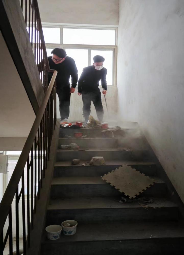 尽管下午冷风习习,老师们参与活动的热情却丝毫未减。老师们准时来到教师公寓集合,手拿扫帚、面戴口罩,分工合作。对教师公寓的楼道进行清扫、擦拭扶手、清理破碎玻璃……老师们井井有条、一丝不苟。