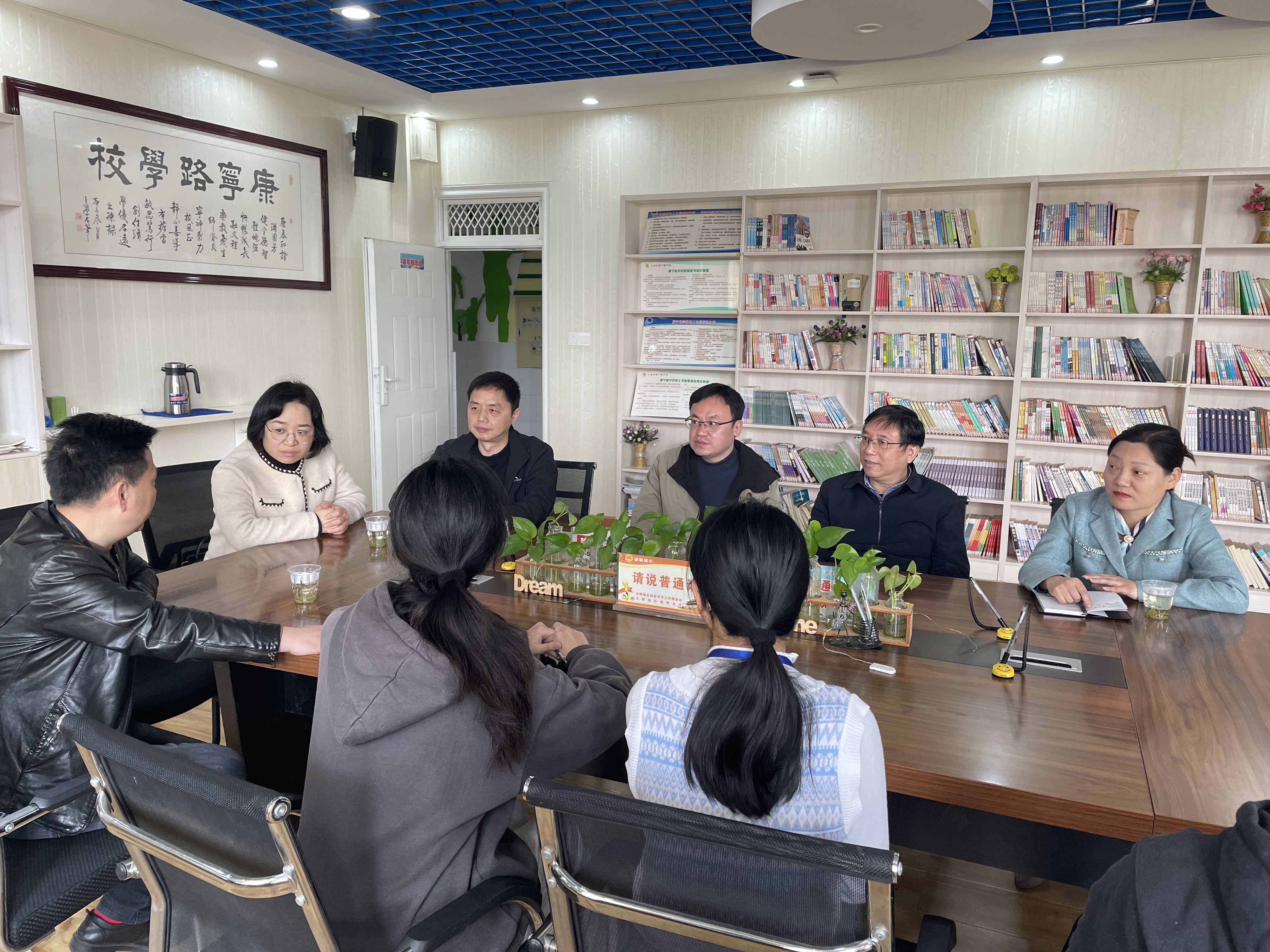 为进一步加强实习基地建设,深化与实习基地之间的交流合作,深入了解我院汉语言文学专业学生的实习情况,扎实稳步推进教育实习工作,3月26日上午,副校长程光文、教学质量管理与评估处处长汪军玲、教务处副处长袁灿在我院党总支书记杜占红、副院长杨东、实习带队教师侯令琳的陪同下,走访了我院的实习基地——康宁路学校,看望我院正在该校实习的14名学生。