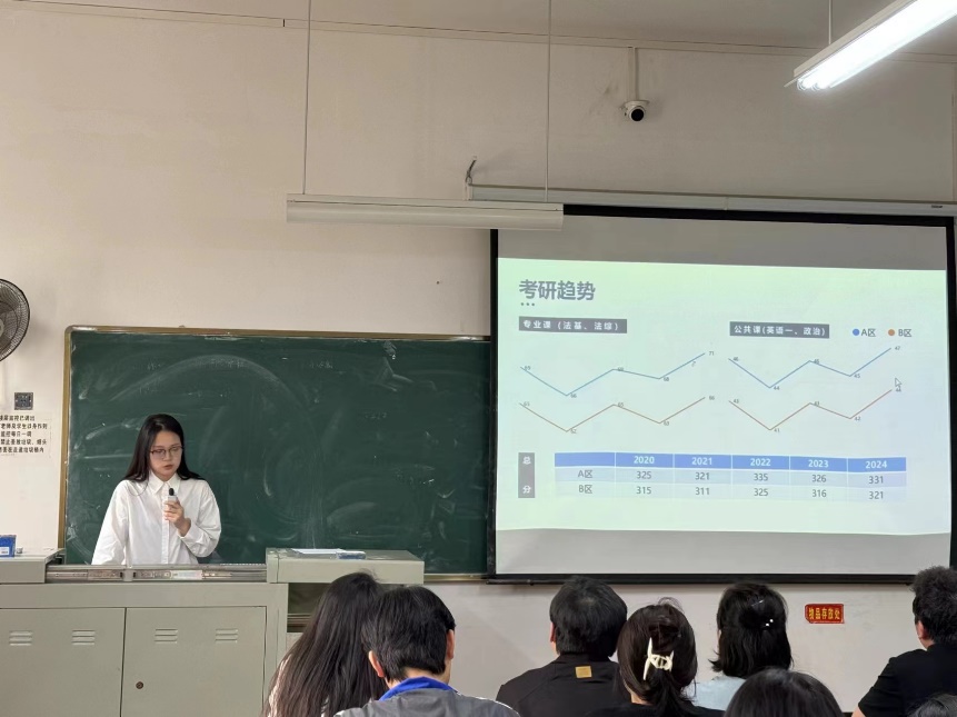 会议进入第三项,由国家奖学金获得者柯晓冉为大家分享考研经验。作为法学专业学生,柯晓冉同学分别从备考计划、名师推荐、建议答疑等三个方面分享了法硕考研经验。柯晓冉同学细致地为学弟学妹们讲解了考研英语的备考细则:从做题技巧到备考书籍的选择、从考研择校到背诵方法都提出了专业的看法,为学弟学妹们指明了方向、做出了榜样。