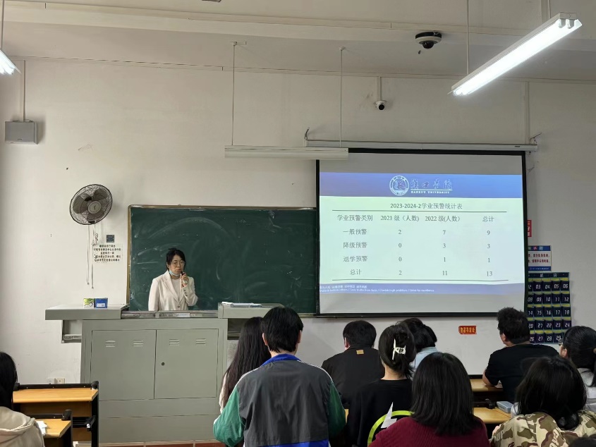 会议第二项,由刘琪老师做各年级学习预警分析。在讲话中,她展示了2023——2024-2学业预警分析表及各年级挂科情况统计表,以数据形式科学严谨地分析了各年级大致的学习情况。对各年级分别做出指导,并希望各班班长、学委将各项通知传达到位,向积极地方向进行改正。