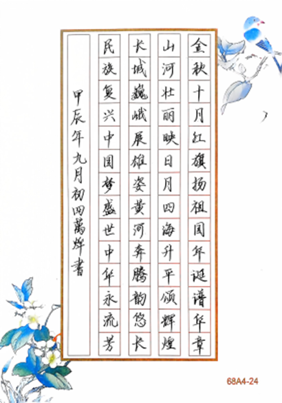 千里江山展新颜,处处飘扬中国红。一抹鲜红,满载深情。值此祖国母亲七十五周年华诞之际,文法学院党总支特举办“以青春之名,书写清澈挚爱。以心中赤星,献礼盛世中华”国庆献礼活动。同学们积极参与本次活动,增强了对自身能力的培养。