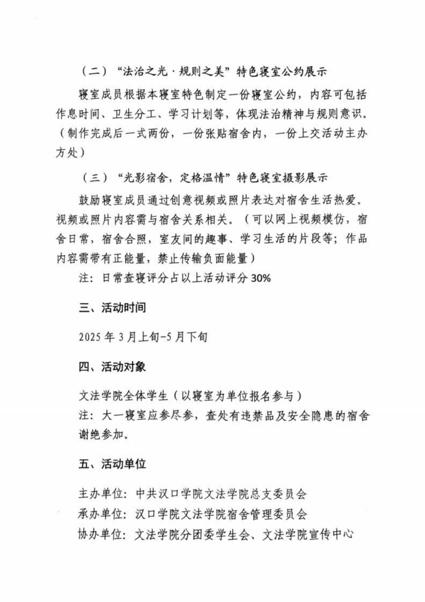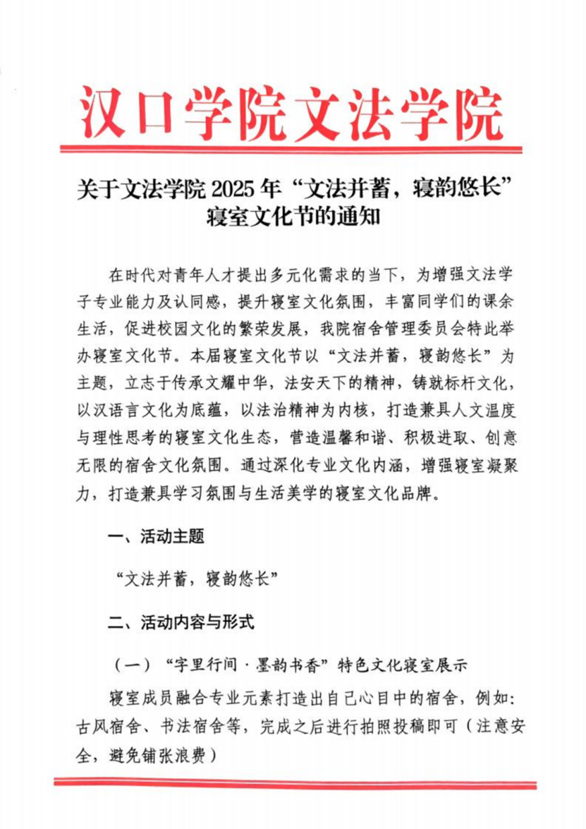 为增强文法学子专业能力及认同感,提升寝室文化氛围,丰富课余生活,我院将举办2025年“文法并蓄,寝韵悠长”寝室文化节。大一寝室应参尽参,存在违禁品及安全隐患的宿舍谢绝参加。