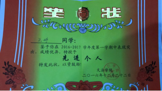 2016年12月获学院“先进个人”称号