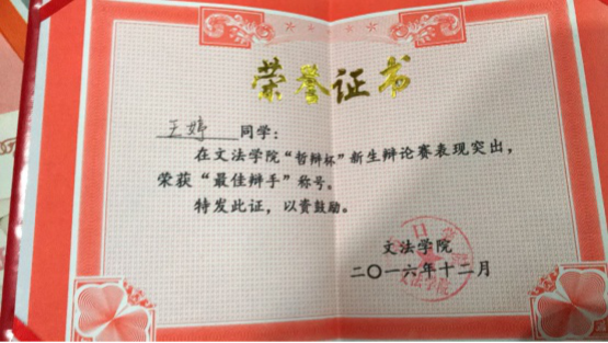 2016年12月在文法学院“哲辩杯”新生辩论赛中荣获“最佳辩手”称号