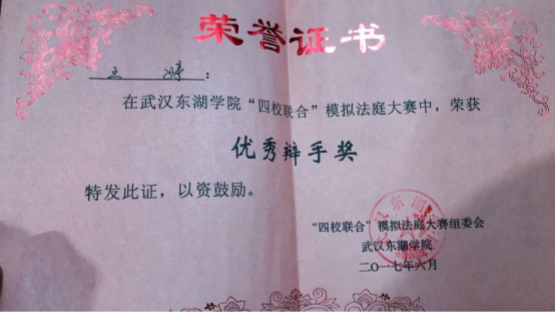 2017年7月在武汉东湖学院“四校联合”模拟法庭大赛中,荣获“优秀辩手奖”