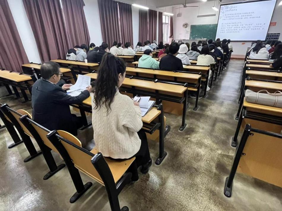专业汇报结束后,江胜清教授在专家联络员侯令琳老师的陪同下,进行教学质量考察。深入课堂听课,对试卷、毕业论文等进行细致检查。下午连续与我院领导、教师、学生代表进行座谈,全方位了解汉语言文学专业人才培养、教学管理与改革等情况。