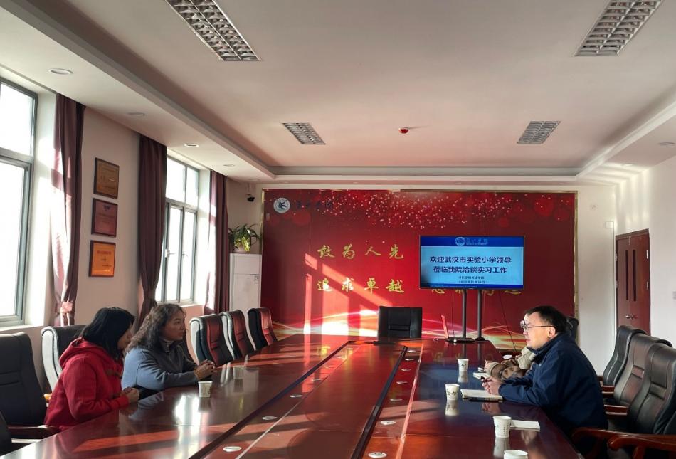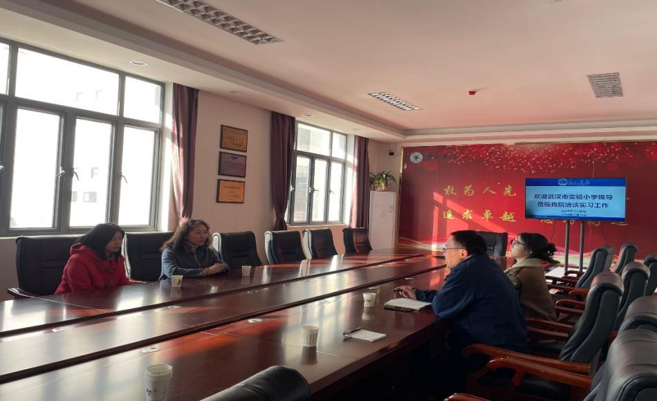 2023年11月14日,武汉市实验小学宋校长、赵主任莅临我校二教0419会议室洽谈实习工作。各专职教师以及实习带队老师李昱、教秘陈思参加会议。本次会议由文法学院教学副院长杨东主持。