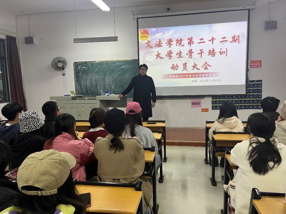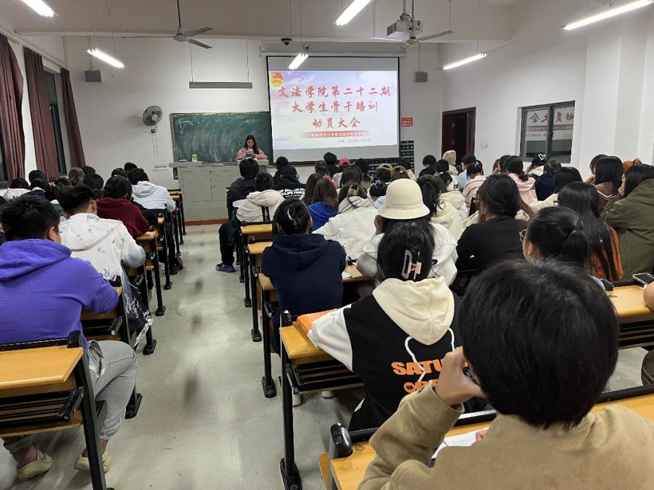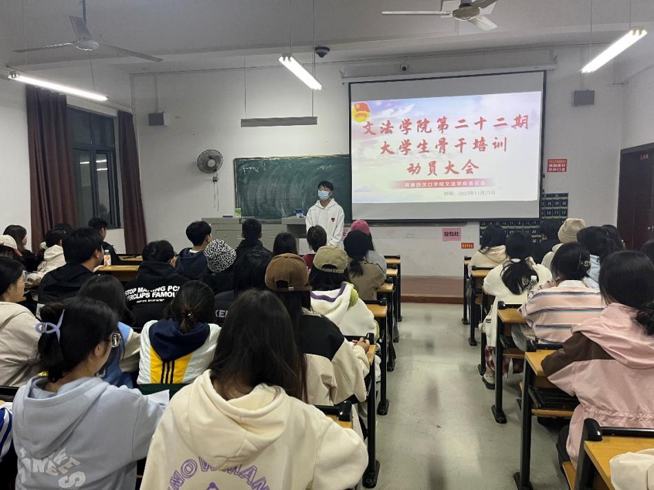为深入学习贯彻习近平新时代中国特色社会主义思想,持续加强团组织自身建设,引导青年坚定不移听党话、跟党走,以实际行动学习党的二十大。培养一批具有忠诚的政治品格、浓厚的家国情怀、扎实的理论功底、突出的能力素质、忠恕任事的青年骨干,造就一批用马克思主义中国化最新成果武装的马克思主义者。文法学院于2023年11月23日下午在2214教室举行了第22期大学生骨干培训动员大会。本次会议由文法学院团委组织部副部长晏皓月主持,文法学院分团委书记陶思铭老师以及第22期大学生骨干培训班学员参加本次会议。