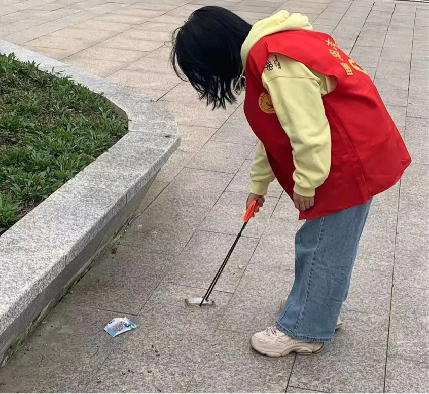 志愿者们到达目的地后,两两成组,拿着工具,按照分配好的路线进行环境清理。早春时节,绿芽新发,草坪上的“白色污染”也格外醒目。大家夹起树丛草坪里的白纸、矿泉水瓶等垃圾,装进垃圾袋里。相互配合,高效推进。碰见未按规定摆放的自行车,志愿者们也将自行车推置指定位置。经过一个多小时的忙碌,公园的环境变得井然有序,整洁干净。