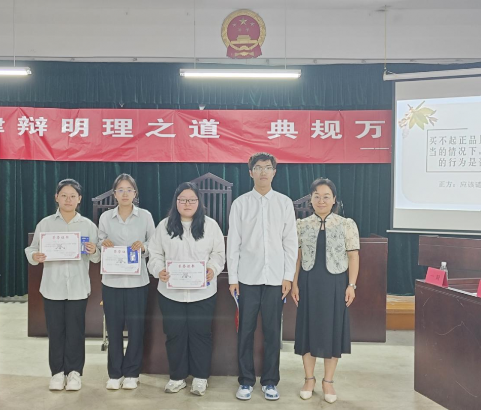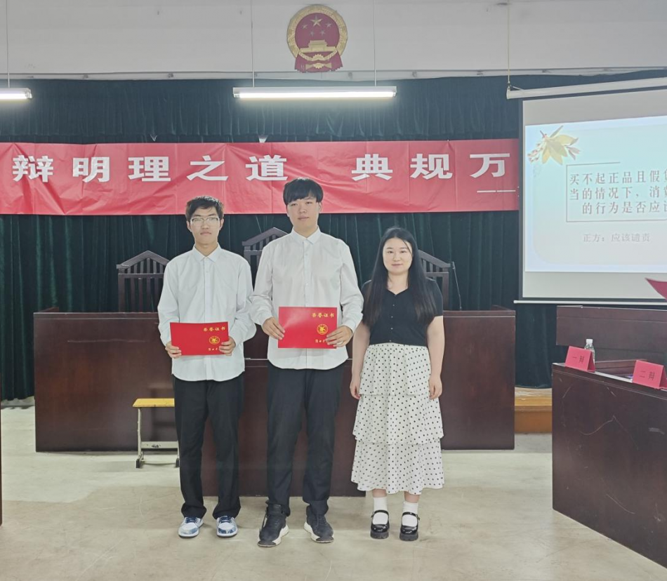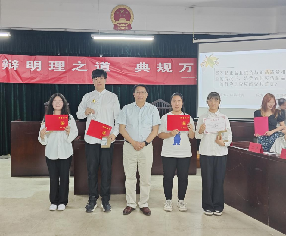 随后,比赛进入颁奖仪式。本次辩论赛的优胜奖为正方,景遐东院长进行颁奖。获得最佳思辨奖的是反方,杜占红书记为其进行颁奖。法学系主任胡越斐则对比赛最佳辩手:陈星,刘伽伟进行颁奖。