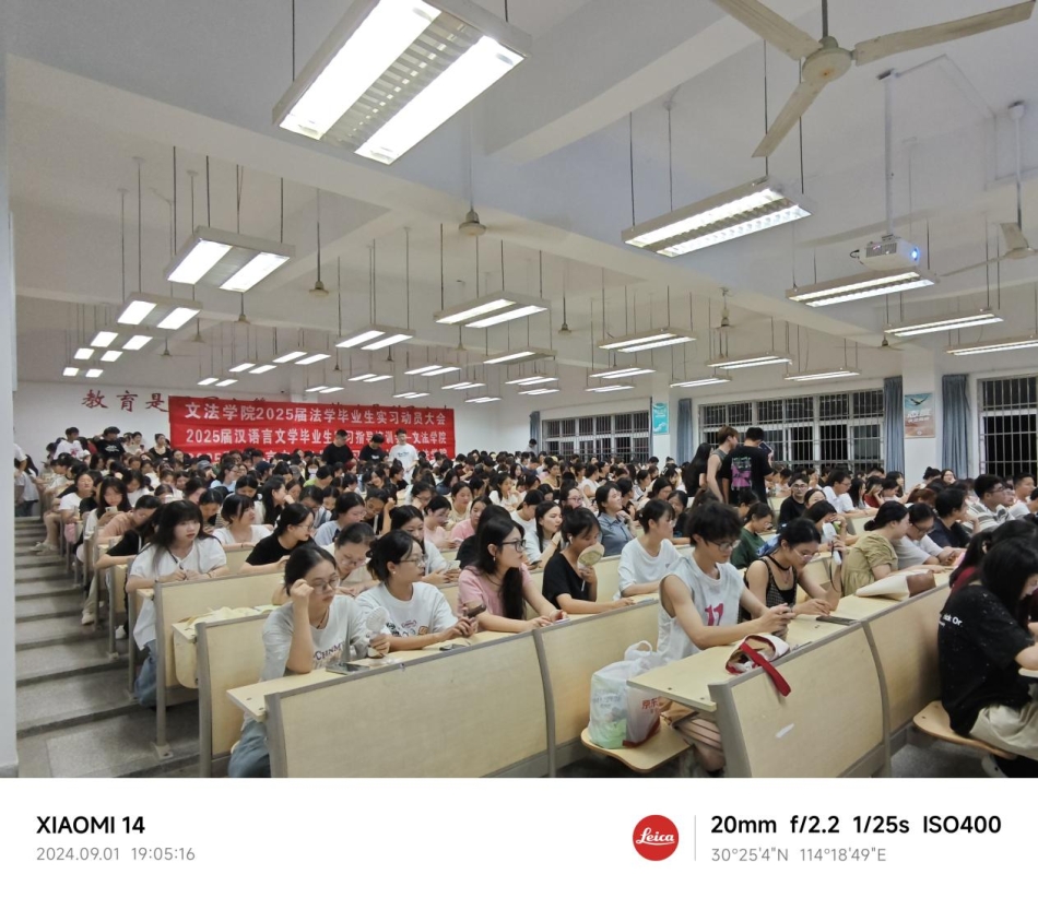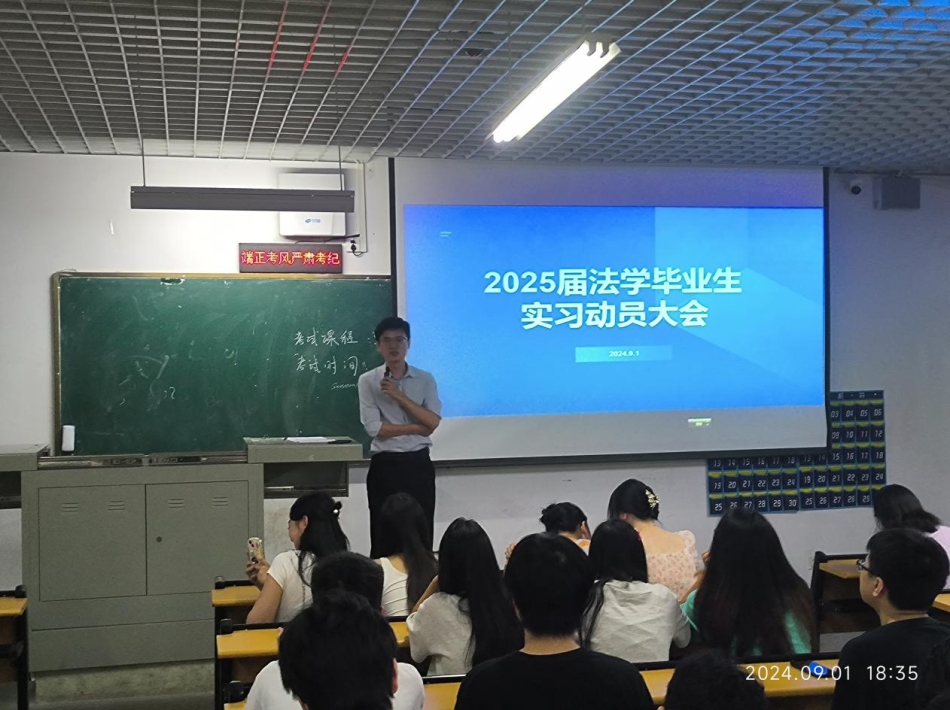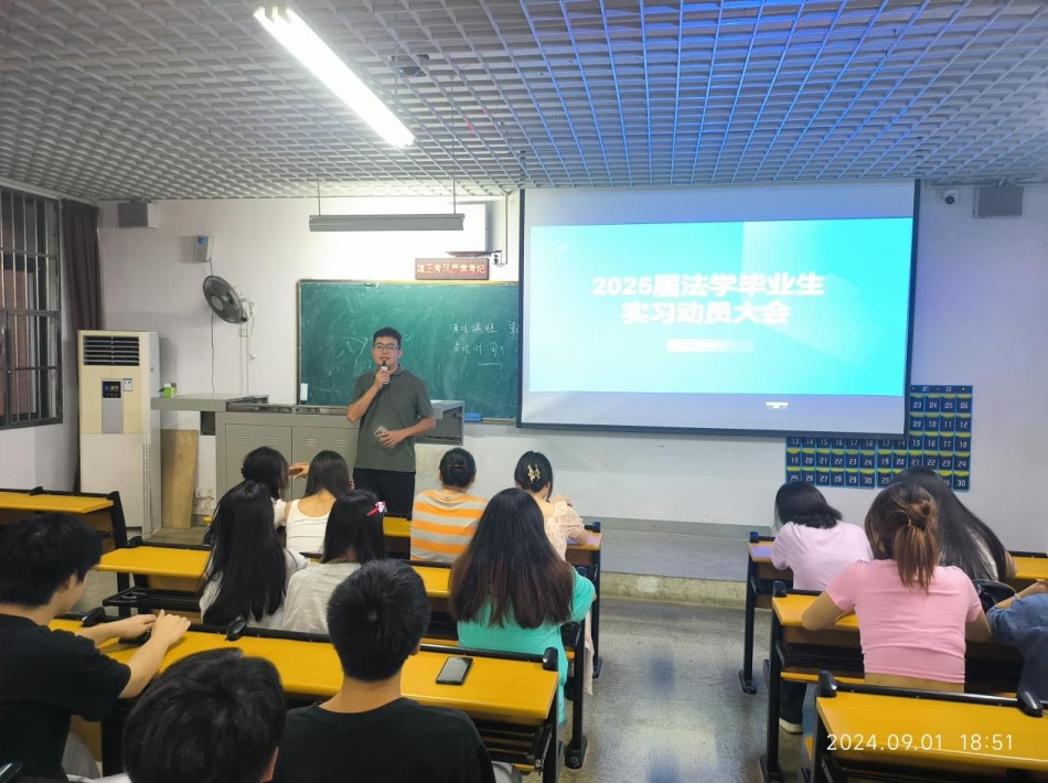 2024年9月1日下午六点半,文法学院法学专业实习动员大会在一教1108举行。文法学院理论法教研室主任吴忌、教师沈建铭,以及2021级全体法学专业学生参加。大会由文法学院辅导员陶思铭主持。