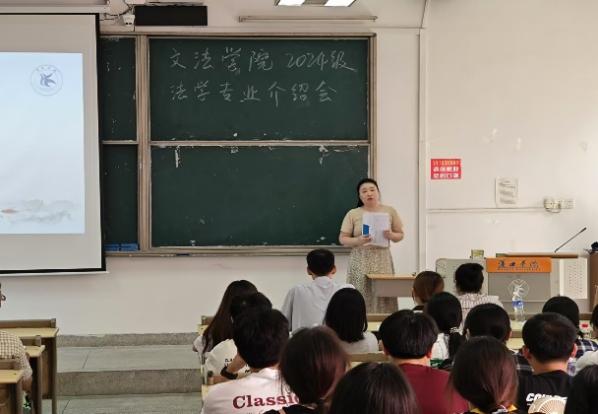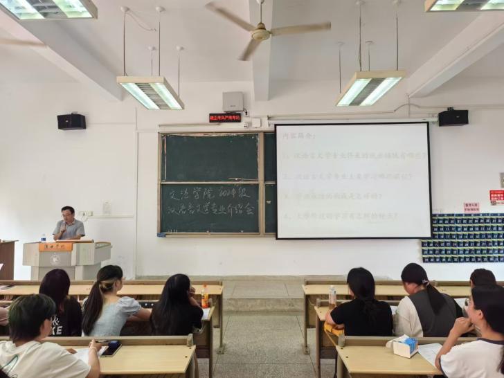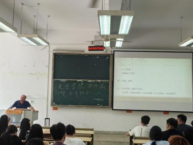 随后,分专业开展专业介绍会。文法学院科研副院长杨智教授从自身的教学经验出发,在1103教室为中文专业和专升本的新生们带来了详细且生动的专业介绍。在讲话中,杨智教授提到:在大学的学习中,不仅有专业内的通史课程,还会在此基础上开设相应的选修课程。随后,杨智教授对部分课程做了简要概述:在语言类课程的学习中,对于古代汉语,要有认识繁体字的能力;对于现代汉语,可以提早准备普通话测试的考级。而语言概论的学习,则是从感性转为理性的学习阶段,需要更高层次的学习能力。而文学类课程,包涵古今中外。对于中国古代课程,最重要的是建构框架,疏通学习脉络;最后,杨智教授强调:“学习是不断进步的过程,要从现象到本质、从线索到规律、从感性到理性。”
