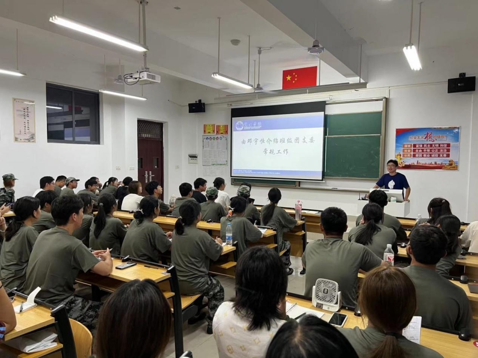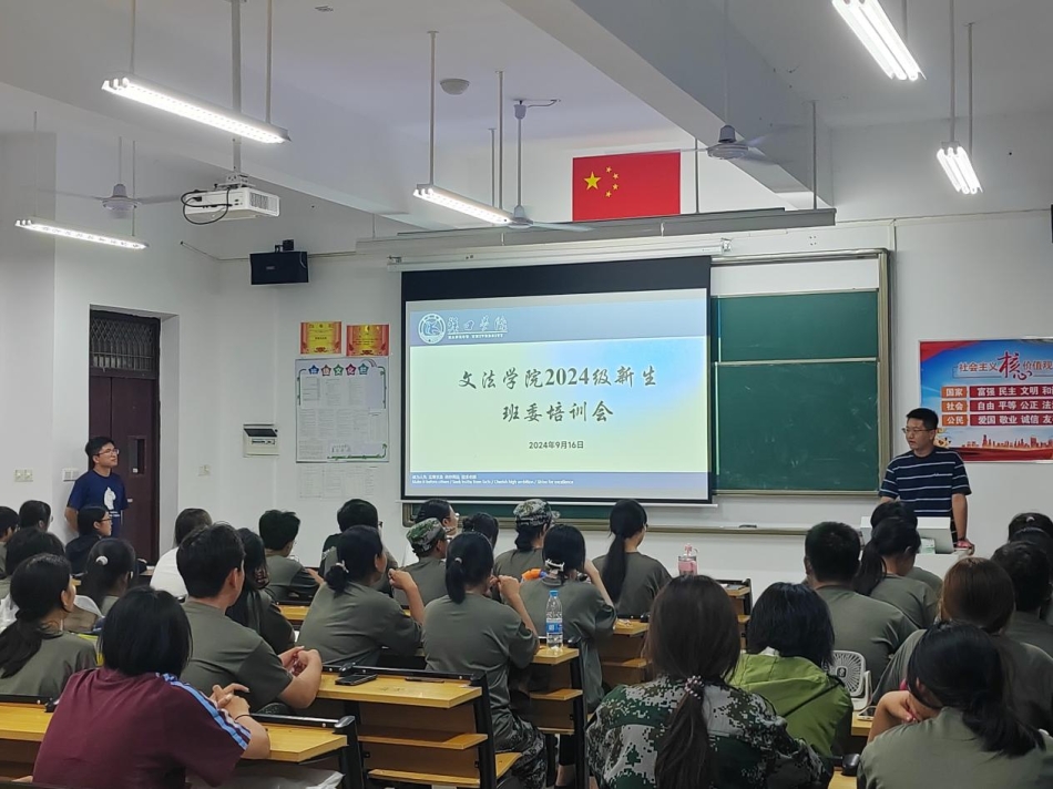 为加强2024级班委对自身工作的认识,系好2024级班委的“第一粒扣子”,我院特于9月16日晚在京山校区B-101教室开展2024级班委培训会。本次会议特邀2021级汉语言文学4班班长刘浩东、团支部书记邓宇恒为大家进行培训,2024级辅导员助理、班主任、全体班委参与此次会议。