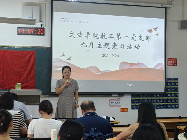 为了全面贯彻党的二十届三中全会精神,加强我院教职工队伍的整体建设,增强学院教师党员队伍的凝聚力,引导教职工将党的理论知识和方针政策内化于心、外化于行,我院于9月20日中午在二教2214教室召开了文法学院教工第一党支部九月主题党日活动,会议由党总支书记杜占红和教工第一党支部书记欧阳叔雯共同主持。