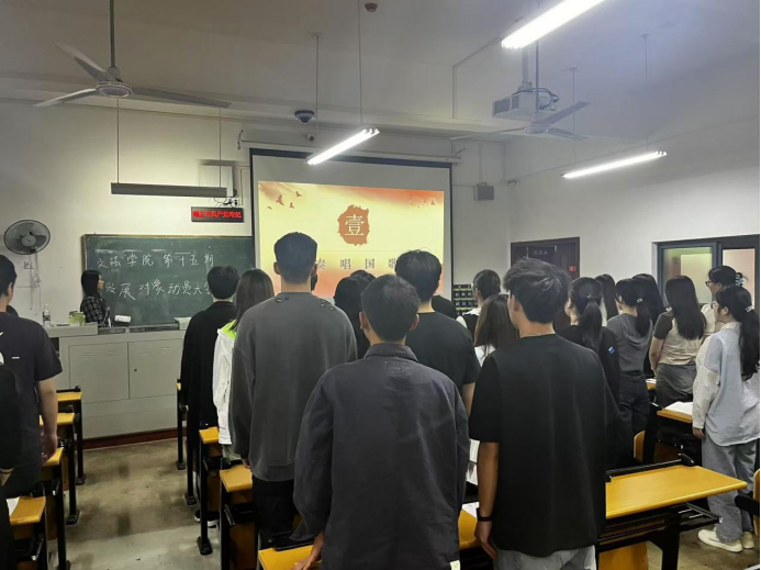 会议开始前,学生助理蒋彤进行点名。随后,全体起立,奏唱国歌。