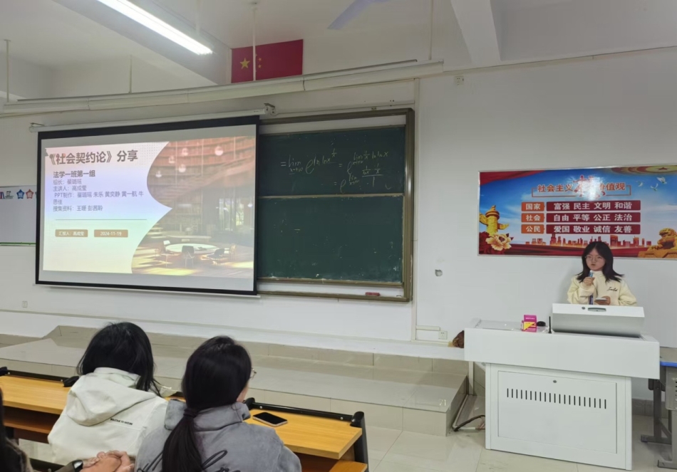 随后,法学一班高成莹同学为大家分享了法国思想家卢梭的作品《社会契约论》,从书籍的背景、核心价值及对当代法律的影响等方面来展开阐述。同时,法学一班的周雍乐同学将这本书与中国的相关故事结合起来,观古通今,给予大家新的时代启示。