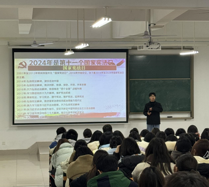 为深化宪法法治教育,彰显宪法精神,捍卫宪法权威,文法学院于12月8日晚上7点,在汉口学院京山校区C201教室开展国家宪法日主题宣讲活动。文法学院学生辅导员陆文元老师出席此次活动,本次主题宣讲活动由法学一班学生何豪主持,文法学院2024级全体同学参加此次活动。