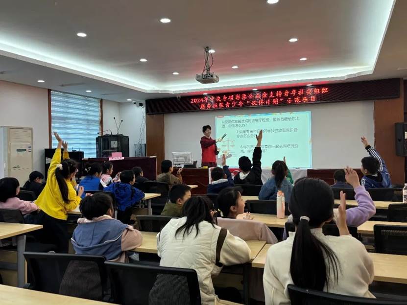 在活动的互动环节,现场氛围被推向了高潮。林同学巧妙地设计了一系列贴近生活的案例问答,这些案例如同一个个生动的小窗口,让孩子们得以窥见法律在日常生活中的具体应用。通过对这些案例的思考与回答,孩子们对《未成年人保护法》有了更为深刻的理解,也更加清晰地认识到如何运用法律武器,勇敢地向生活中的违法行为说“不”,孩子们积极回应,课堂气氛热烈。