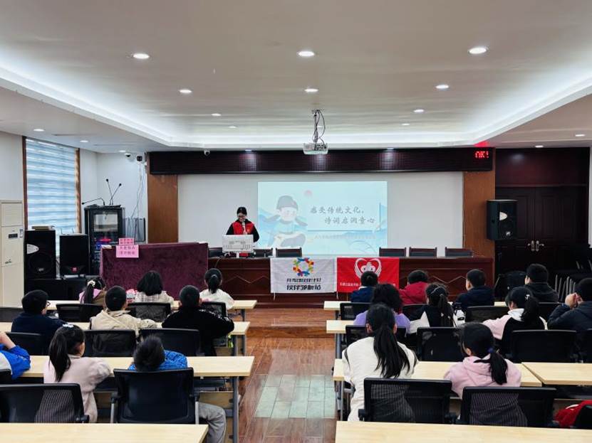 活动伊始,主讲人谭同学以亲切的开场白拉近了与孩子们的距离。她强调古诗词是中华文化的瑰宝,承载着深厚的情感和智慧。她说:“希望小朋友们能在诗中感受美、思考爱,让传统文化成为心灵的伙伴。”其话语点燃了孩子们的好奇心,引起现场阵阵掌声。