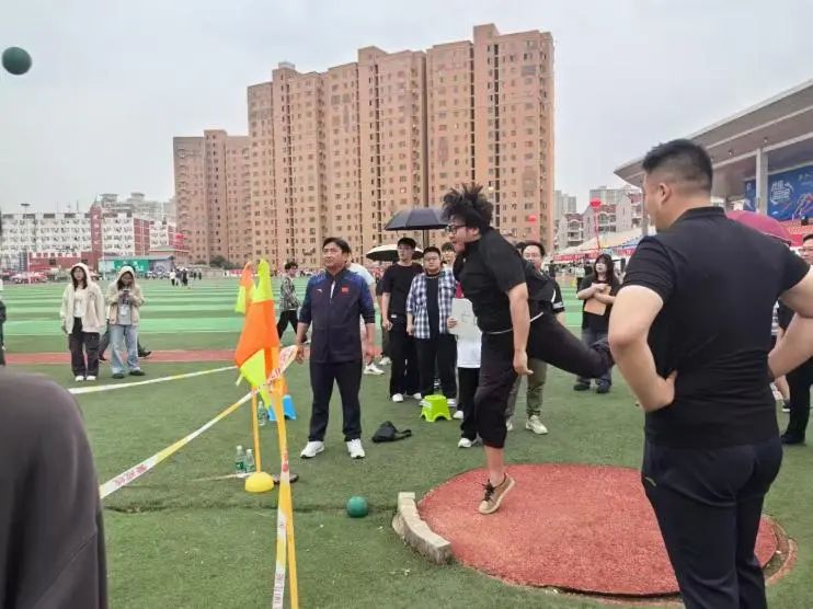 田径赛场竞争激烈:100米短跑赛道上,文法学院的选手们如离弦之箭,爆发力十足,全力冲刺,展现出惊人的速度;1500米和800米长跑中,选手们步伐沉稳而坚定,呼吸急促却咬牙坚持,不断挑战体能极限,向着终点奋勇迈进;跳高场地里,选手们助跑、起跳、翻越横杆,动作连贯而优美,一次次向新的高度发起冲击;跳远沙坑旁,选手们奋力一跃,在空中划出一道优美的弧线,落地时溅起的沙粒仿佛在为他们的拼搏喝彩。
