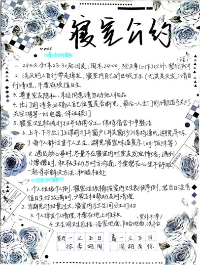 在24栋318寝室,检查小组被一张插画风格的寝室公约所吸引。该寝室成员、汉语言文学专业学生周同学介绍:“我们用优雅的蓝紫色玫瑰装饰边框,将作息规范、互助约定融入其中,既实用又有韵味。”22栋311宿舍的寝室公约则立足法学专业的特殊性,凸显契约精神,其内容与本寝室具体实际相结合,构建了一个理性、有序且温暖的法学共同体。