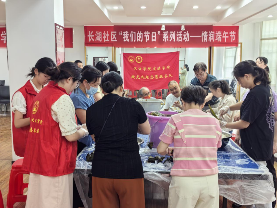 5月29日,服务队赴武昌区首义路长湖社区和江夏区纸坊新北路社区开展端午活动。长湖社区组织居民包粽子并慰问特殊群体,新北路社区结合包粽子、科技助老和环境清洁传递关怀。随后又参与了江汉区民权街道大龙社区"星光夜市"公益集市,维护秩序、引导居民,融入法律咨询营造了温馨的节日氛围。