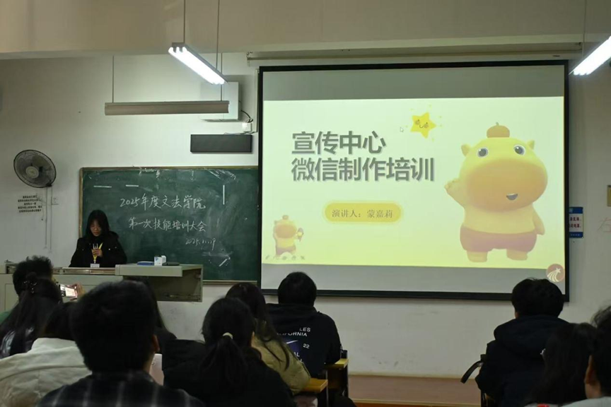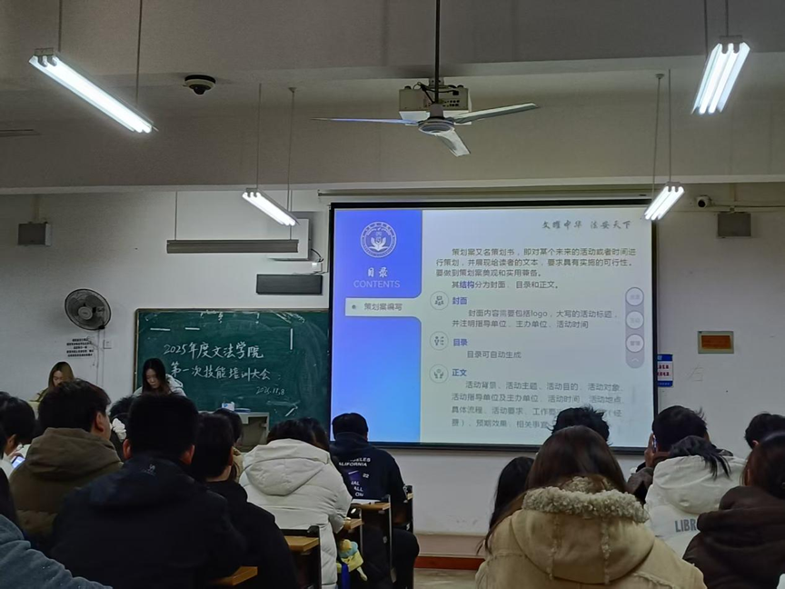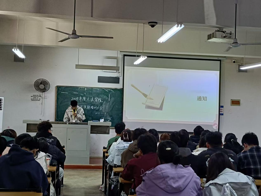2025 年 11 月 18、19 日中午,文法学院在二号教学楼 2207 教室举办 2025 年度第一次技能培训大会,各部门学生骨干及相关成员参与,由综合办公中心主任周宇帆主持。