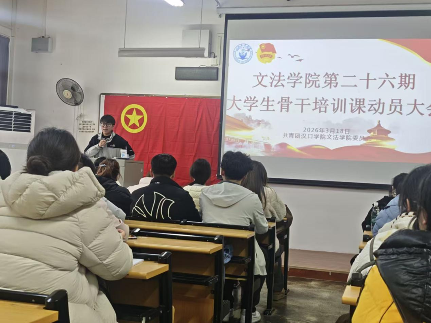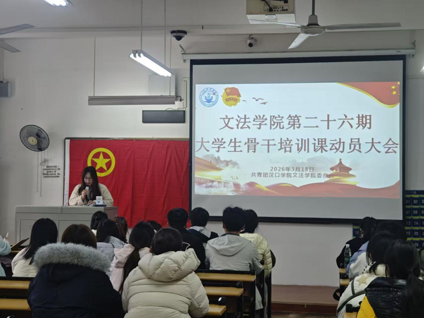 2026 年 3 月 18 日,共青团汉口学院文法学院委员会于二教 2219 教室举办第 26 期大学生骨干培训班动员大会,由分团委组织部部长唐佳淋主持,分团委学生副书记冯晓波及全体参训学员、组织部部员参会。